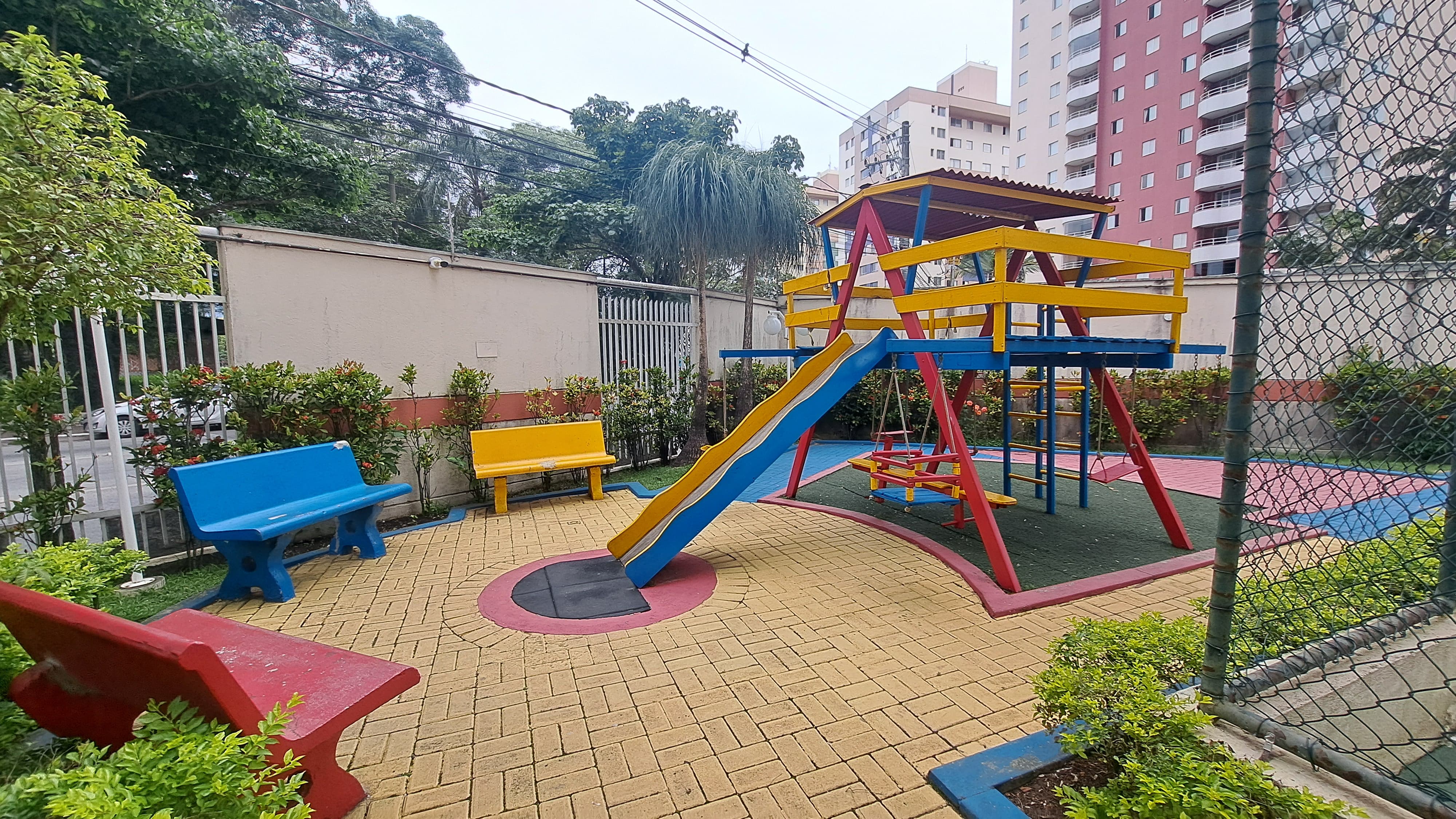 Área de lazer do condomínio com churrasqueira, forno de pizza, piscinas (adulto e infantil), quadra poliesportiva, playground, salão de festas e salão de jogos.