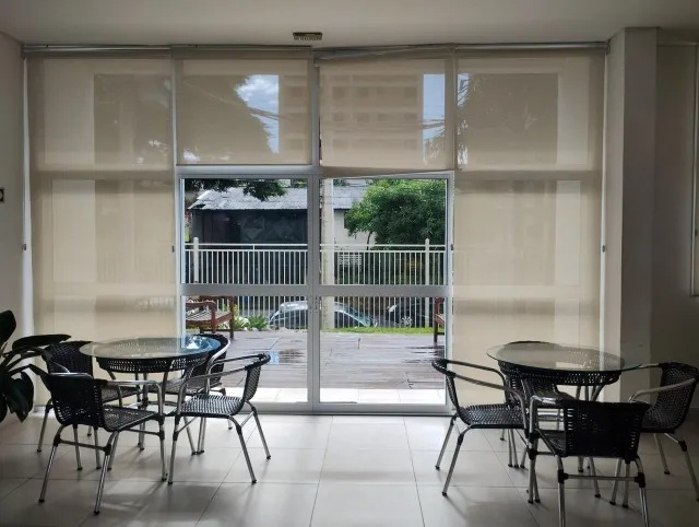 - Varanda gourmet com móveis planejados e com persiana de vidro.