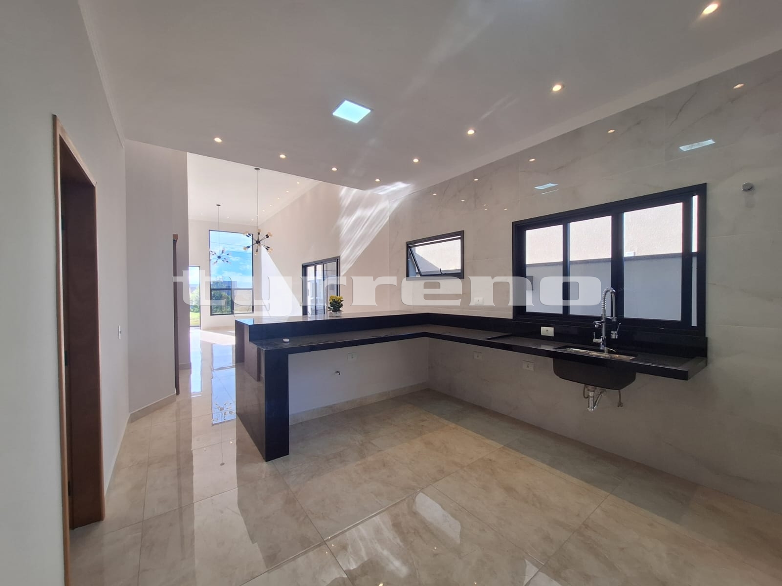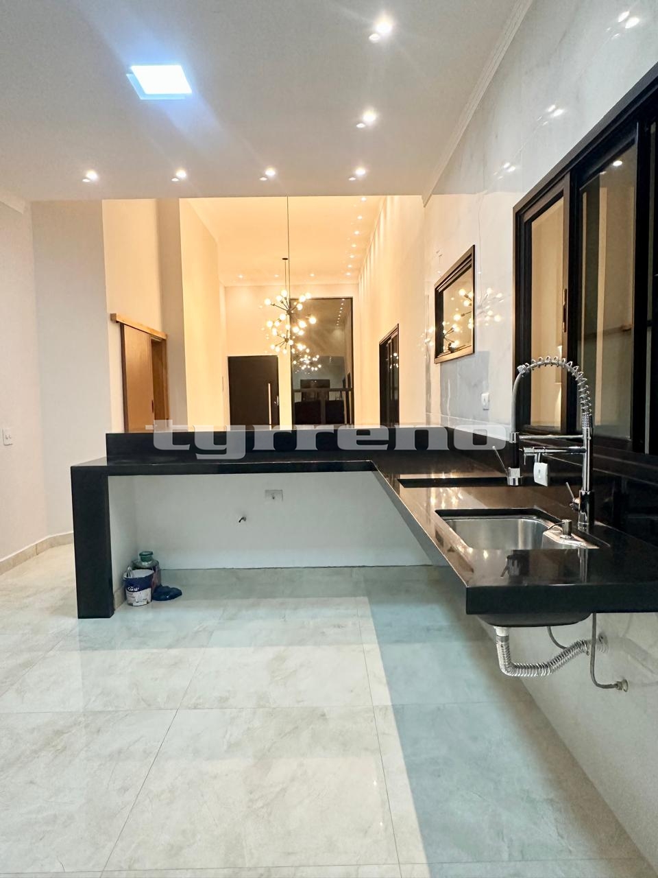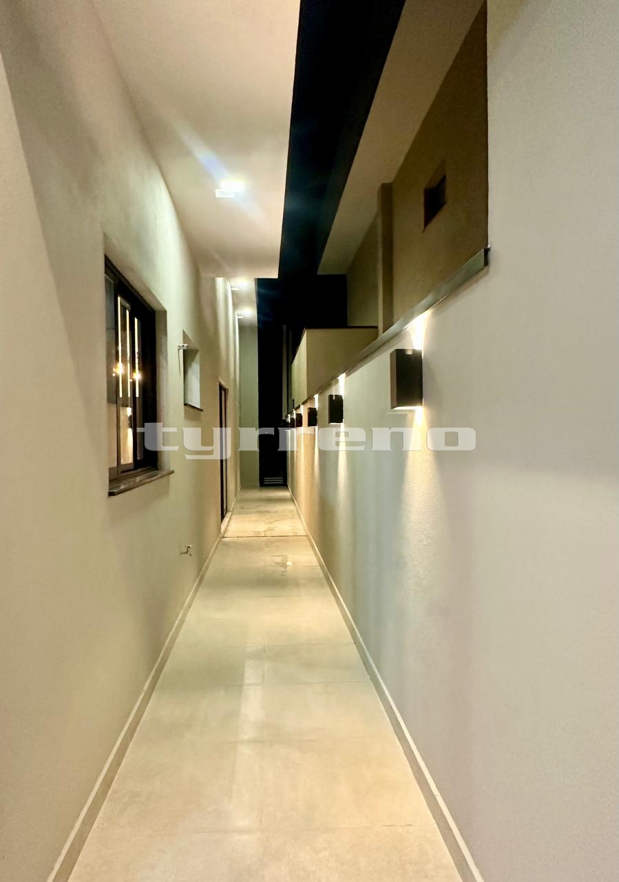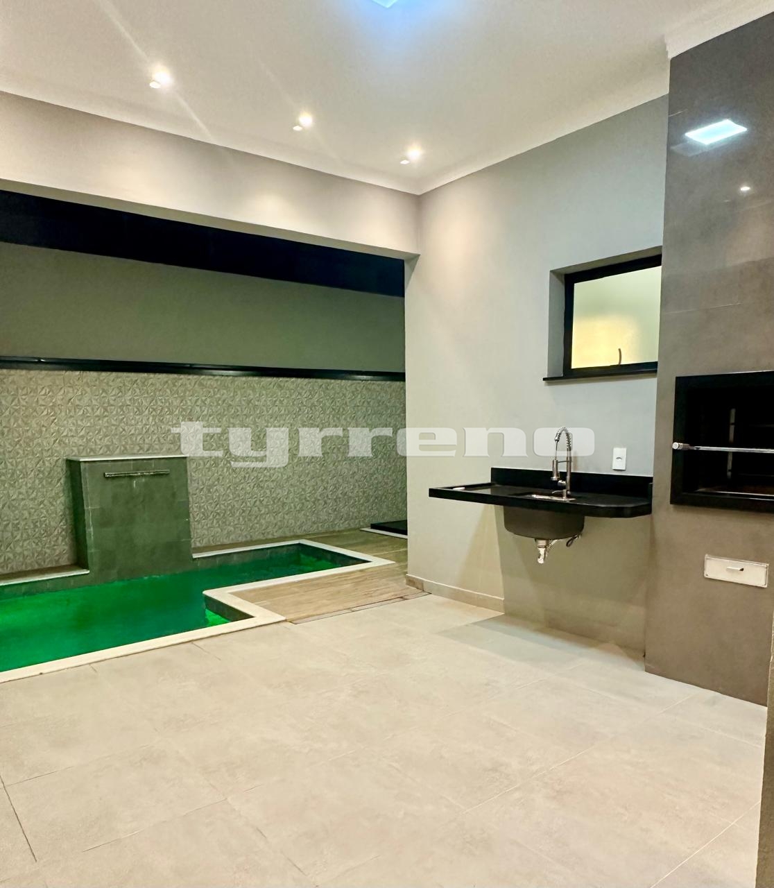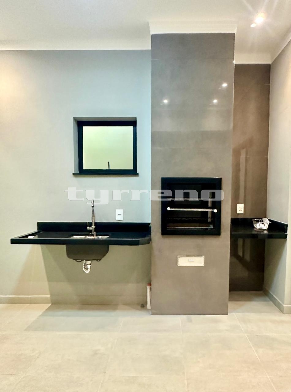 A casa toda em porcelanato na área interna e externa, bancada, pia e lavatórios em granito, conta com um projeto luminotécnico super moderno, piscina em concreto armado com cascata e LED, painel em alumínio ripado na parede da garagem como consta no projeto, na cor amadeirado acompanhando o modelo e cor da porta de entrada. Sendo três dormitórios, um deles é uma suíte com closet, banheiro social, sala de estar, sala de jantar, cozinha, área gourmet com churrasqueira integrada próximo a piscina, banheiro externo, lavanderia, ducha, garagem coberta para dois automóveis. Esquadrias pretas linha premium.