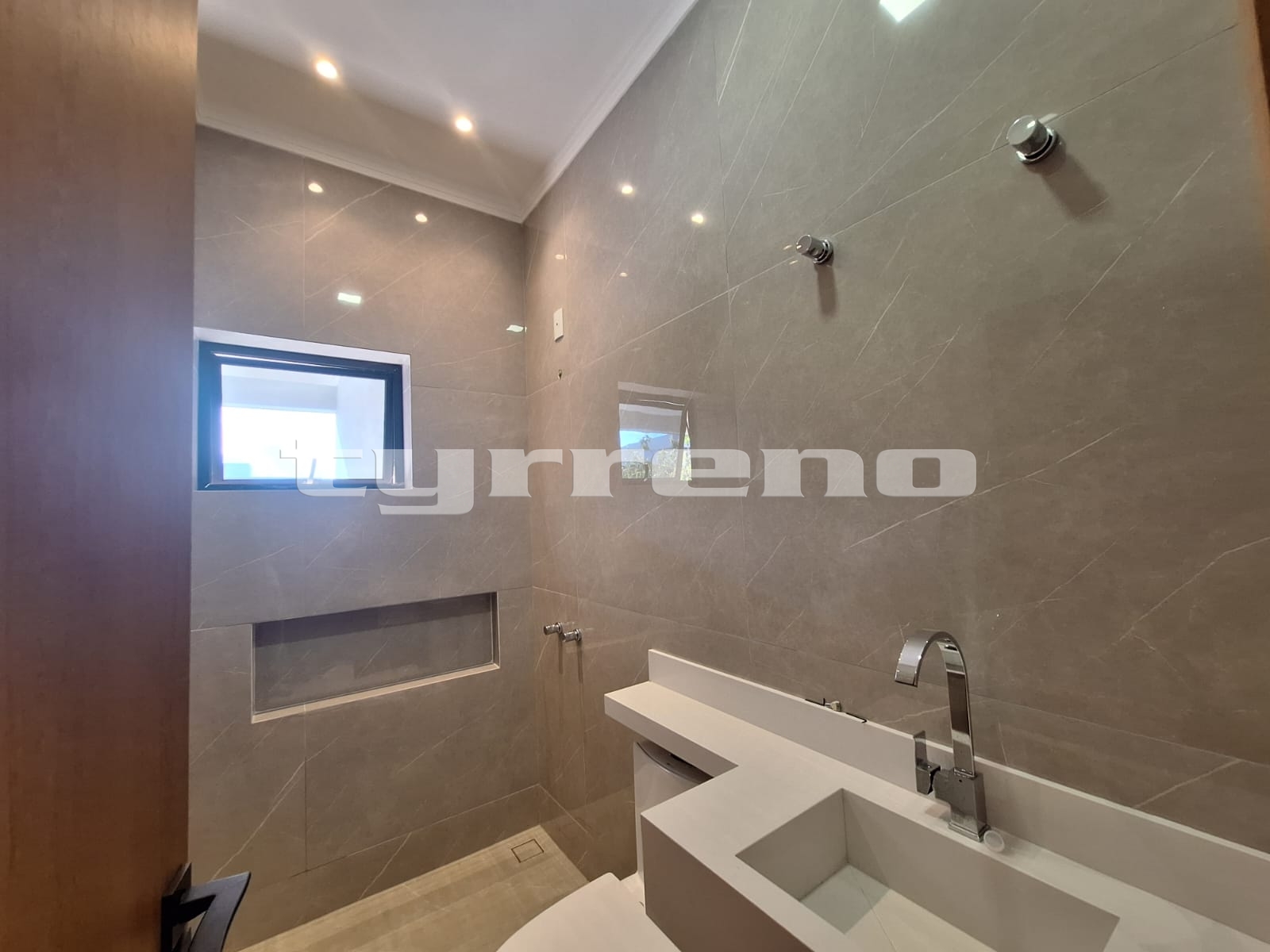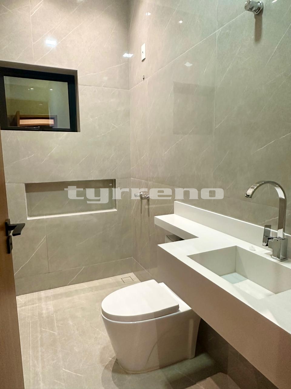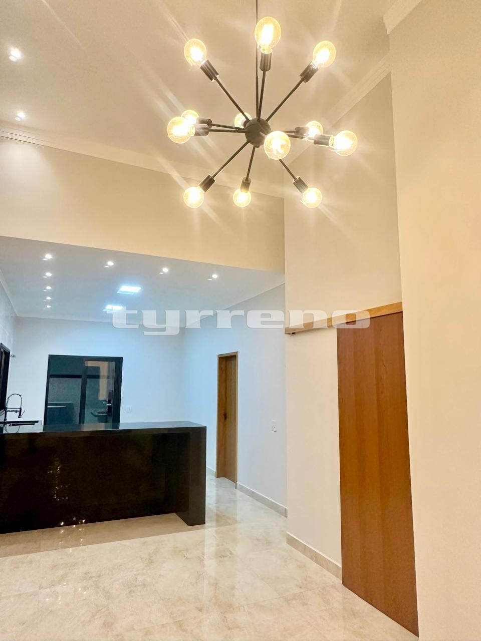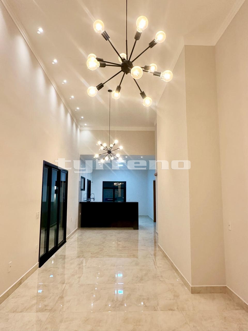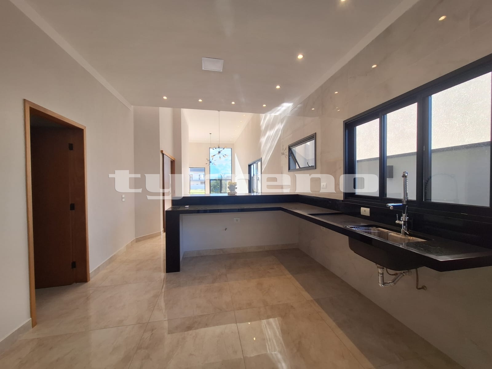 A casa toda em porcelanato na área interna e externa, bancada, pia e lavatórios em granito, conta com um projeto luminotécnico super moderno, piscina em concreto armado com cascata e LED, painel em alumínio ripado na parede da garagem como consta no projeto, na cor amadeirado acompanhando o modelo e cor da porta de entrada. Sendo três dormitórios, um deles é uma suíte com closet, banheiro social, sala de estar, sala de jantar, cozinha, área gourmet com churrasqueira integrada próximo a piscina, banheiro externo, lavanderia, ducha, garagem coberta para dois automóveis. Esquadrias pretas linha premium.