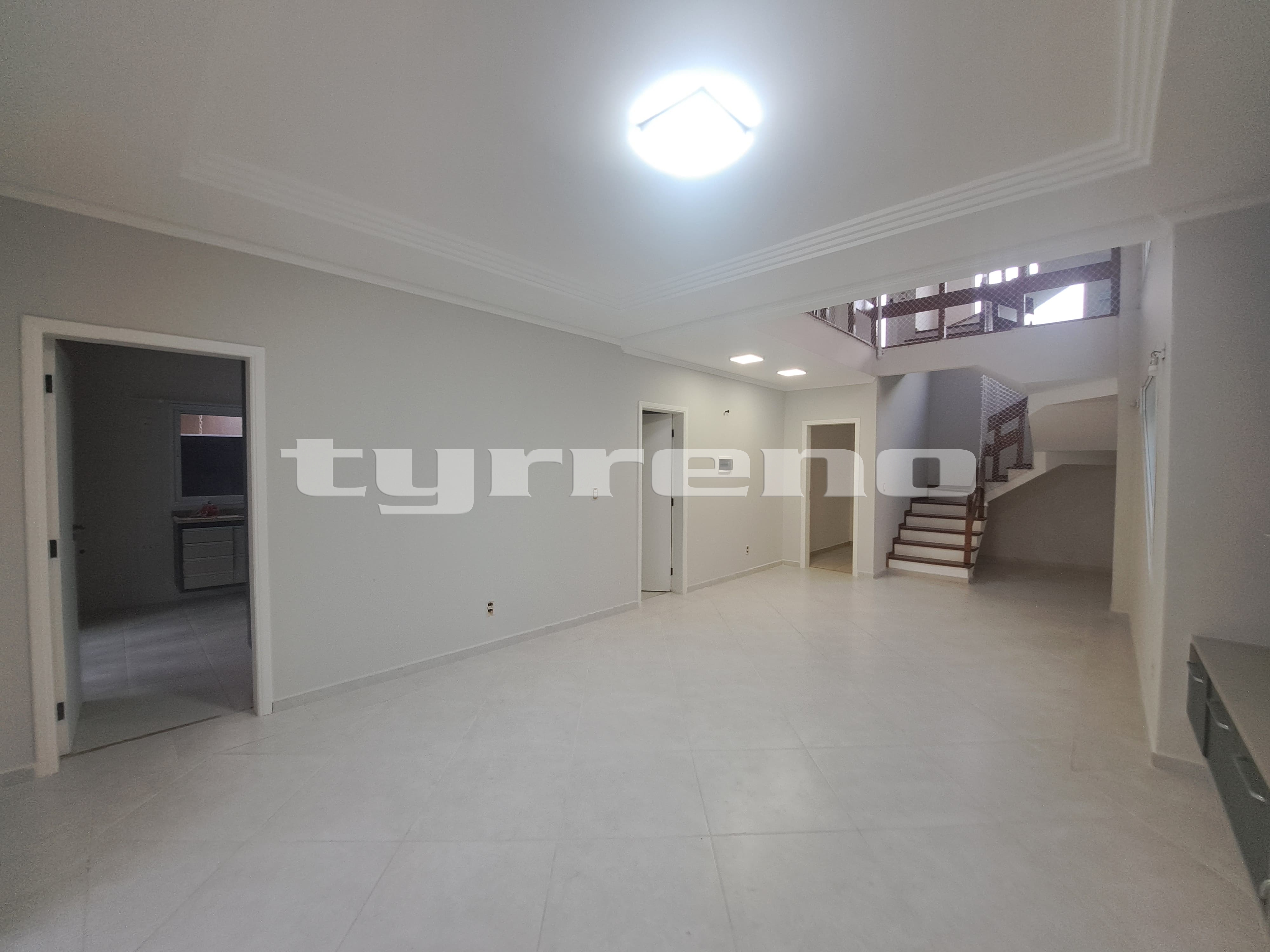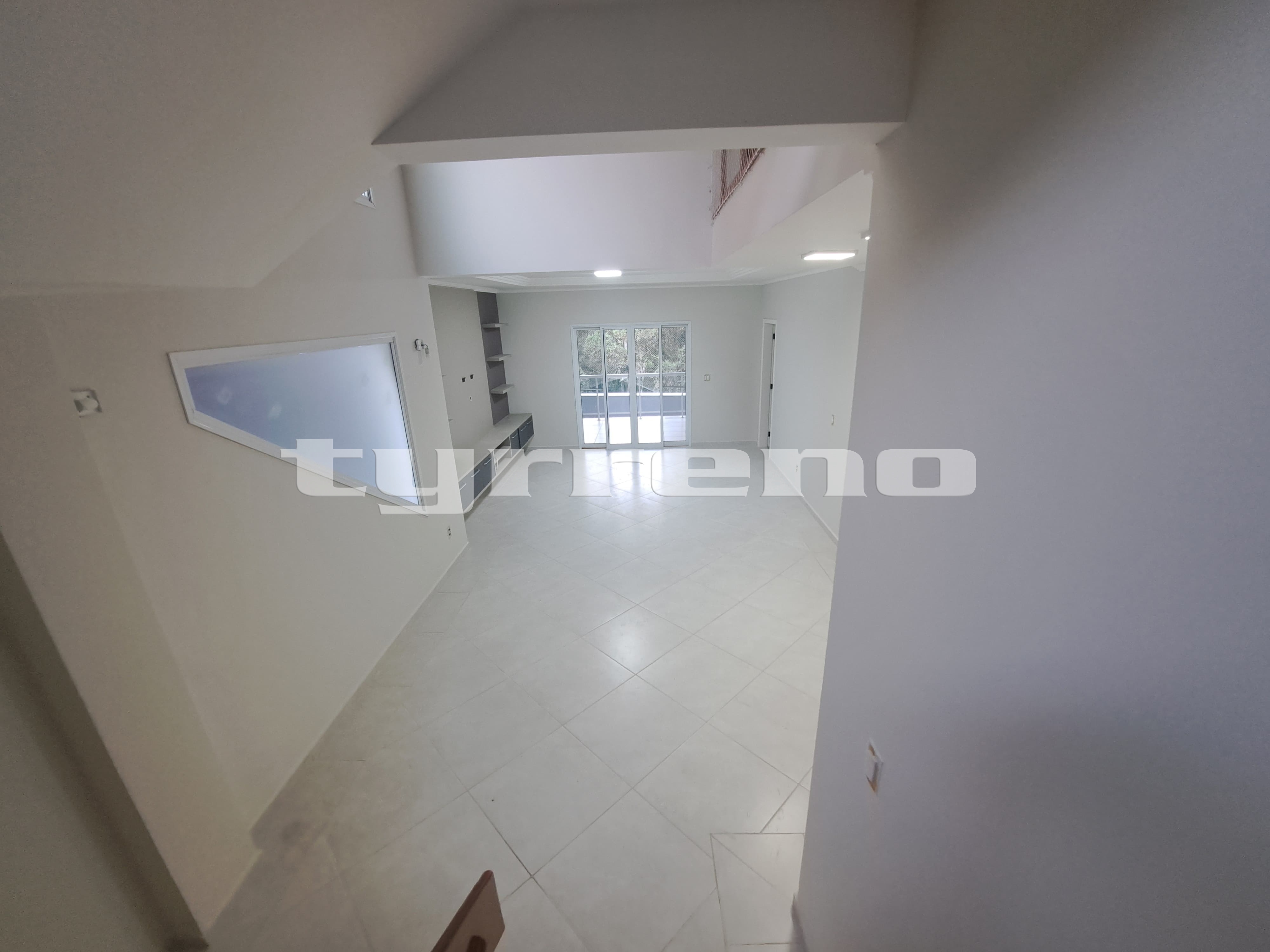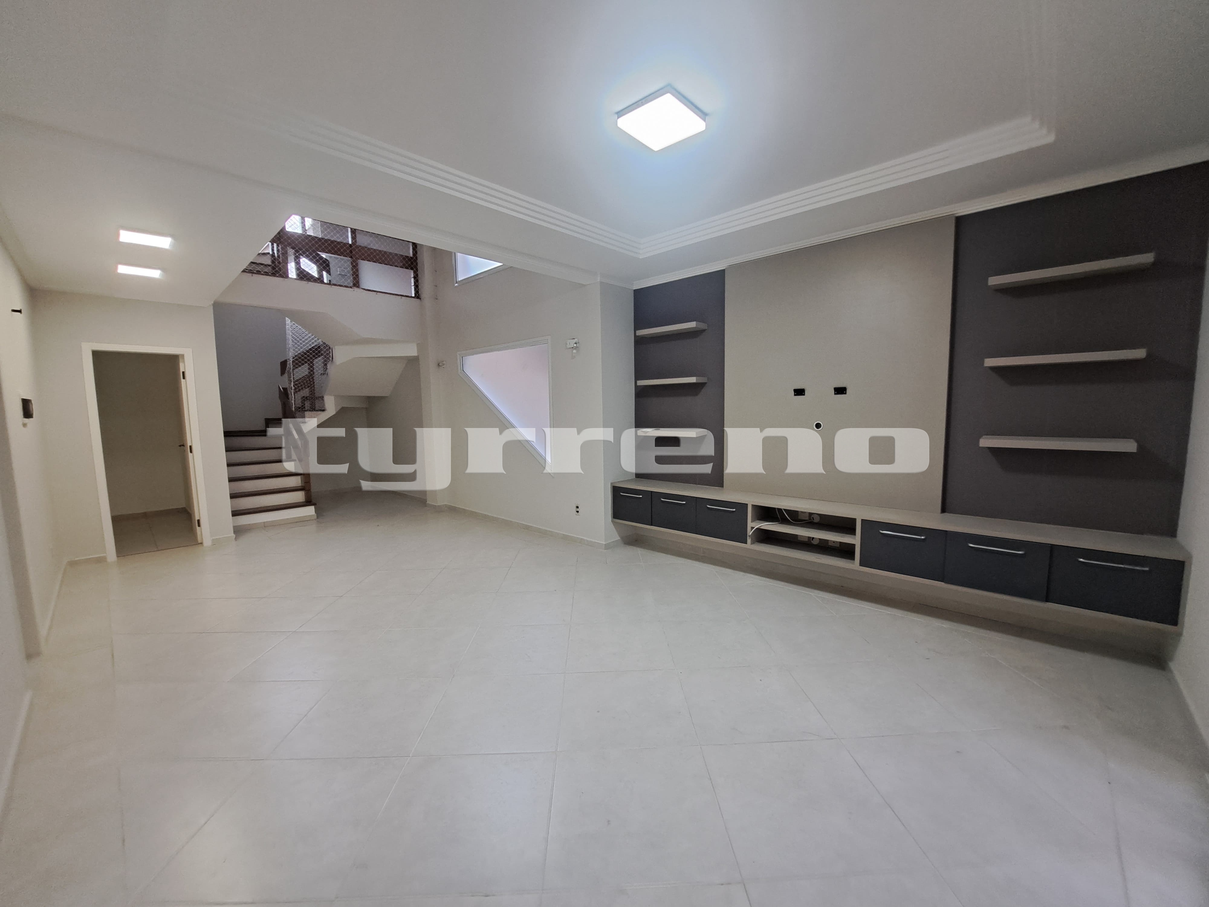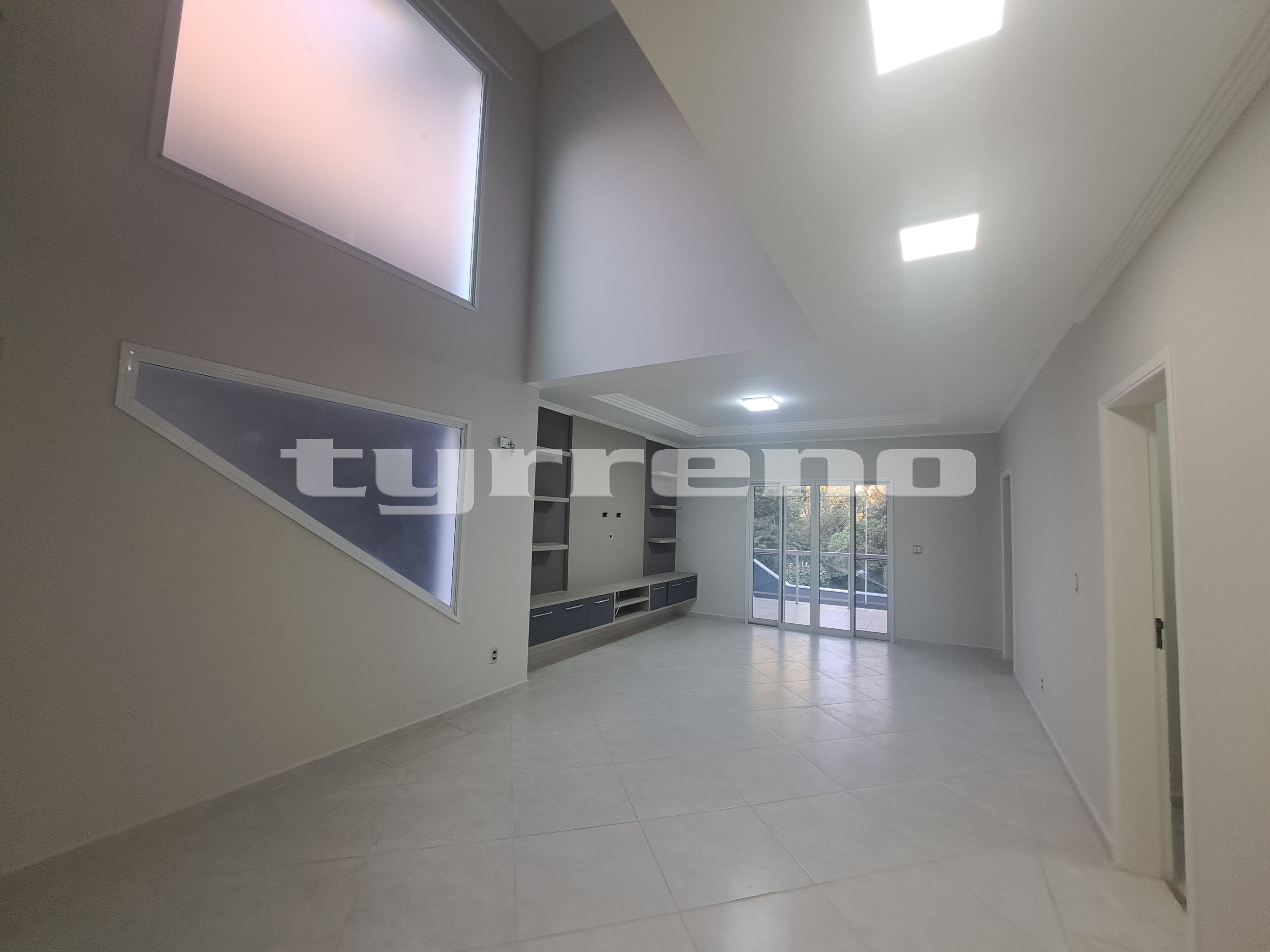 Sala ampla com pé-direito duplo e painel de TV